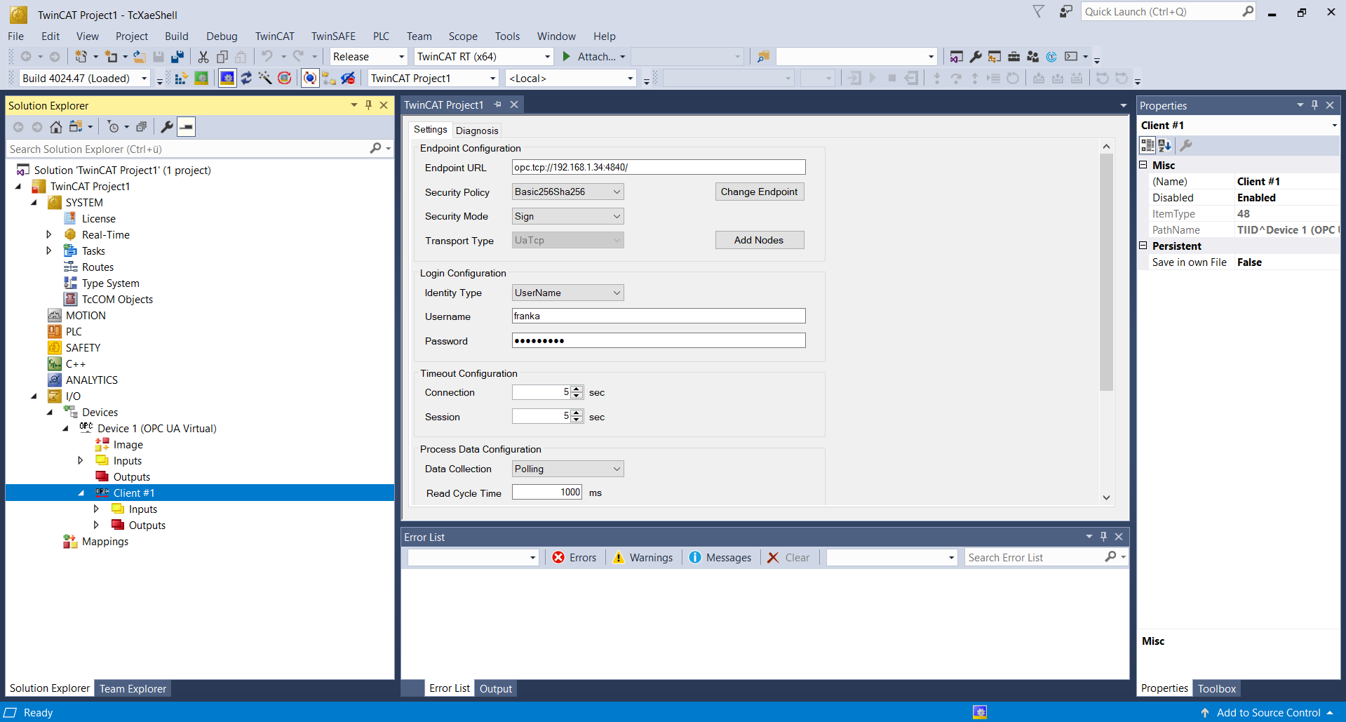 Device. With a right-click on the added device, you can add a new client module to the project. In the Client, type opc.tcp://robot.franka.de:4840 or
